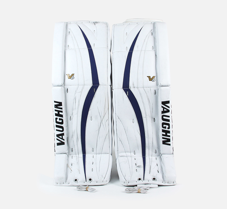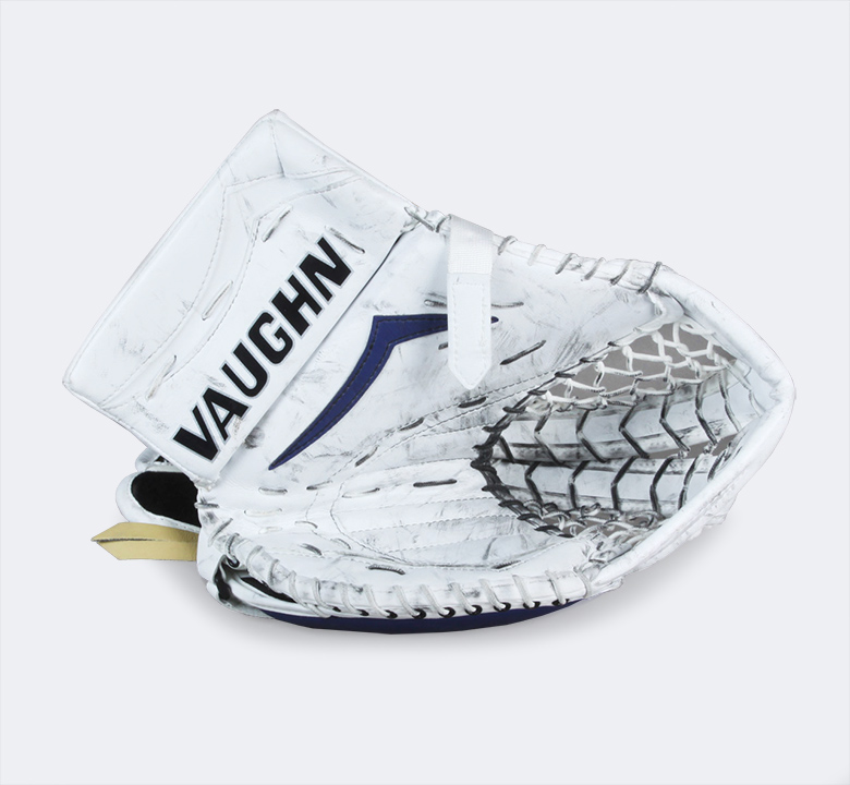 My blocker is also Vaughn. I believe it’s a Vaughn V6 2200. I mean, for me, I think a blocker is a blocker. I don’t feel a lot of difference between the brands and models and all that. Sometimes you can feel a difference in how the stick is in your hand. It can be kind of awkward sometimes if you want to have a different position and you feel like you can’t really get there because of all the padding and all that. But in the end, I feel like if I use a blocker once I feel good with it. I mean, I know some goalies are really careful when they pick their blocker, but for me I’ve never had a blocker that I didn’t really feel good with, so this was an easy choice.